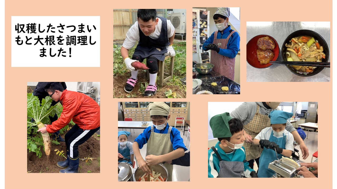 収穫した さつまいもと大根を「さつまいも大学芋餅」と「大根入りカレーうどん」にして2学期最後の昼食にしました。 さつまいも大学芋餅は中学部で何度も作ったメニューで、作るたびに味が上達したメニューです。 大根入りカレーうどんは、うどんから手打ちしたもので、パスタマシンで生地を切り分けて作りました。 大根にカレーのつゆが染みて、とってもおいしかったので、みんなお代わりを何度もしていました。