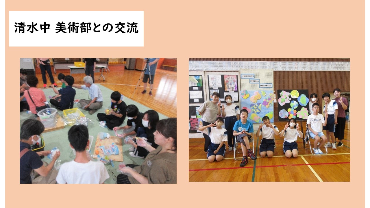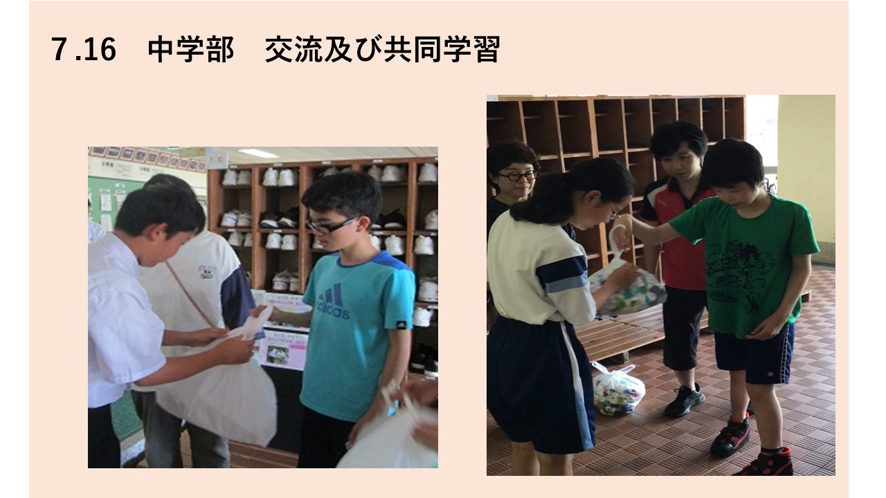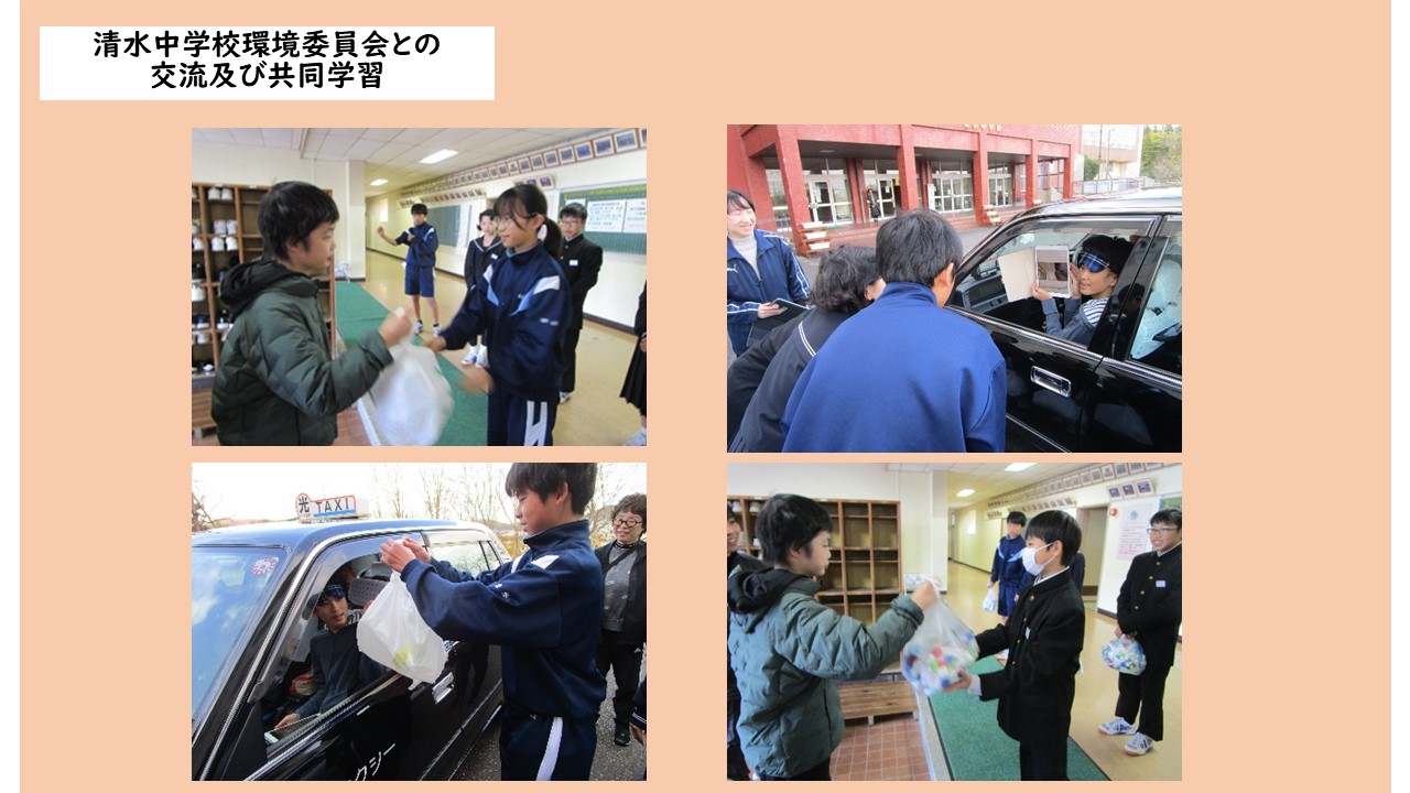 清水中学校環境委員会では、エコキャップを集め、発展途上国の子供向けワクチン代として寄付するための活動を行っています。 本校中学部のリサイクル作業(ペットボトルのラベル剥がしと潰し作業)で出たエコキャップを、清水中学校に持参し、受け取ってもらいました。 また、お返しに、清水中学校で集めたペットボトルを受け取りました。