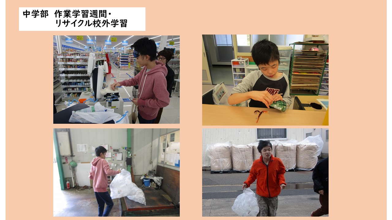 ◎中学部からは作業学習が始まります。いろいろな作業種を経験して、自分にできることに気付き、社会の中で自分を生かすための基礎的な力を育んでいきます。11月には1週間程度の作業学習週間を設け、集中して普段から行っている作業(リサイクルなど)に取組ます。また、3年生を対象として、事業所の見学や実習体験も行います。