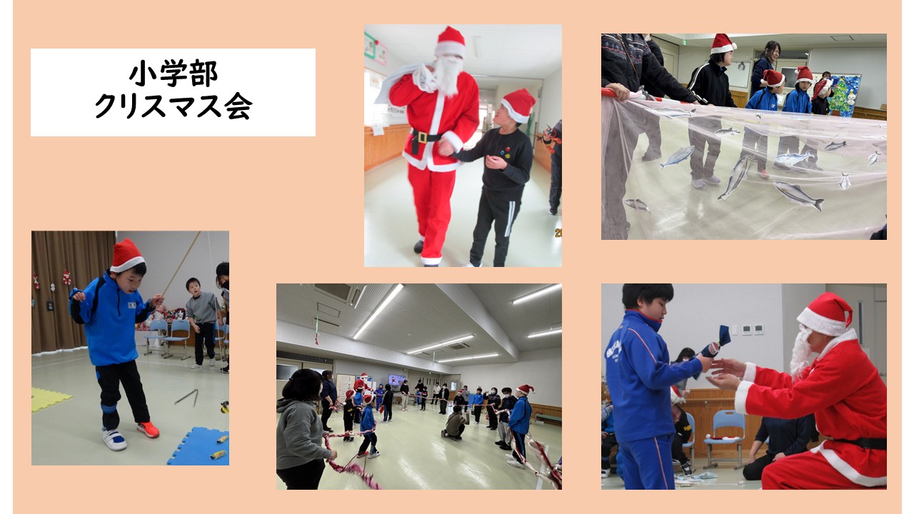 12月12日(金)に小学部のクリスマス会を行いました。ドミノやソーラン節、お菓子釣りゲームなどをしました。 サンタさんが登場し、みんなは大喜び。プレゼントをもらって、とても嬉しそうでした。サンタさんと一緒に踊ったり写真を撮ったりして楽しみました。